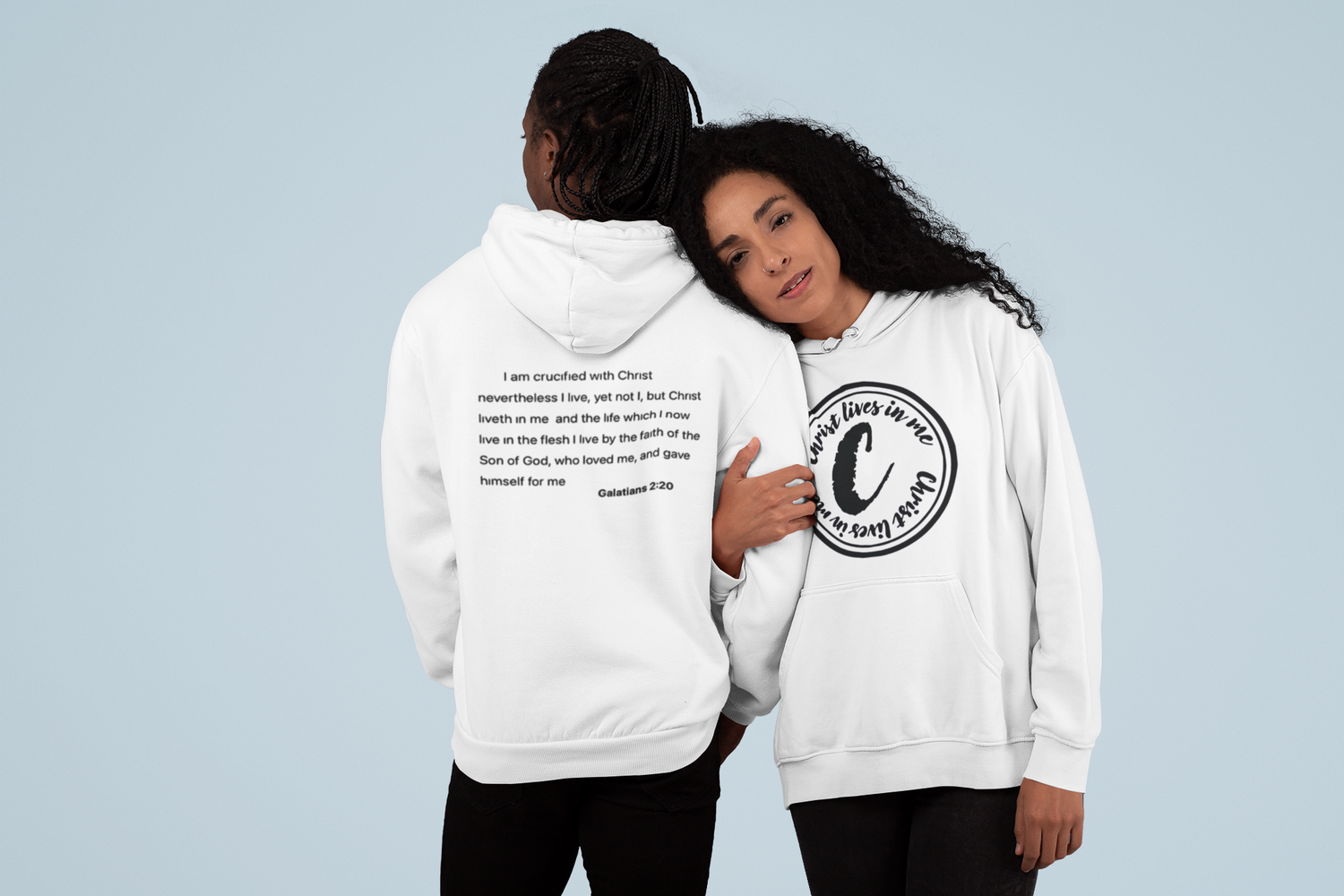 Galatians 2:20 is printed on the back of all t-shirts and hoodies.